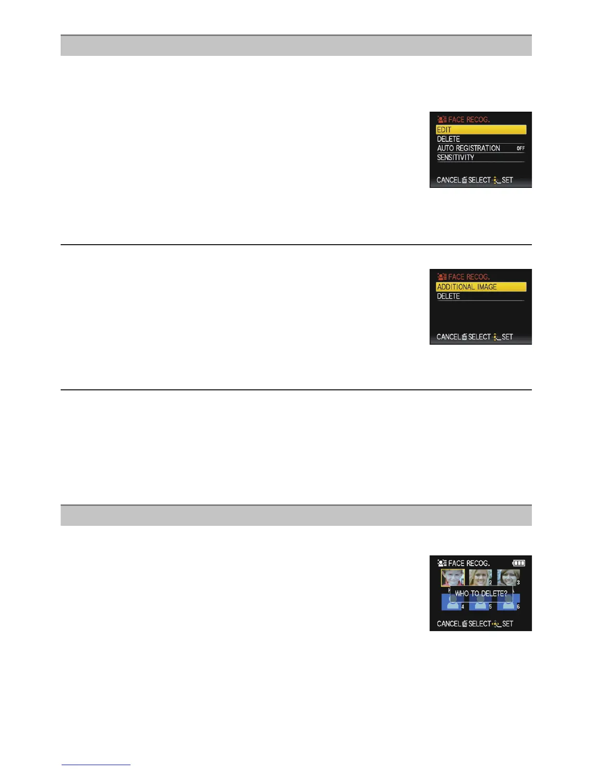 7 Press 2/1 to select the face image to delete, and then press [MENU/SET].