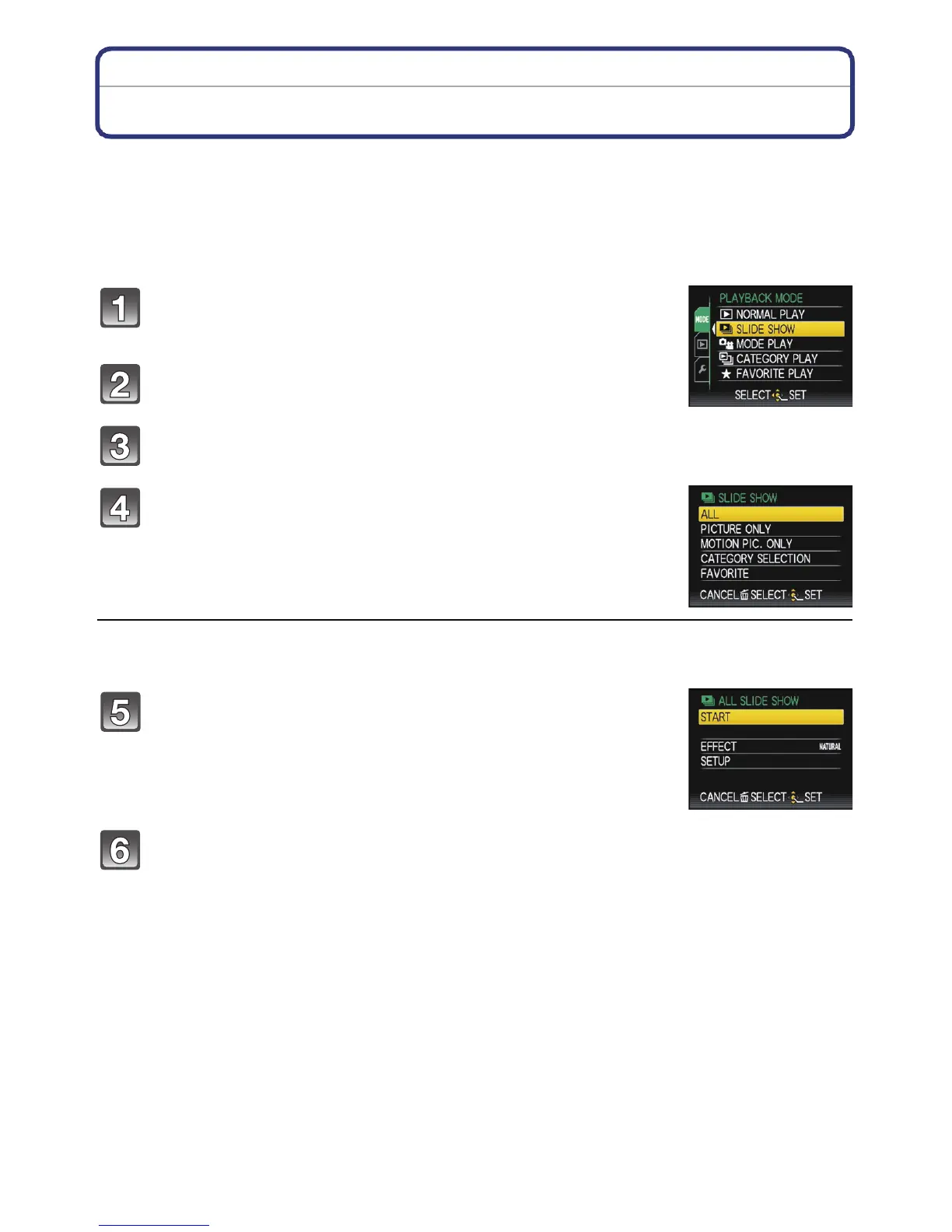 Press 3/4 to select [SLIDE SHOW], and then press [MENU/SET].