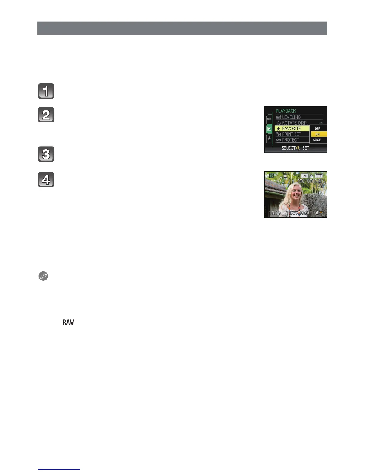 Select [FAVORITE] on the [PLAYBACK] Mode menu. (P27)