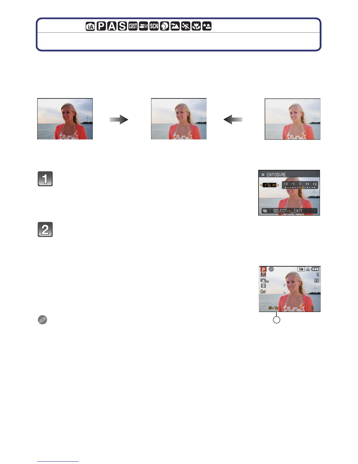 • Exposure compensation cannot be used when in [STARRY SKY] in Scene Mode.
