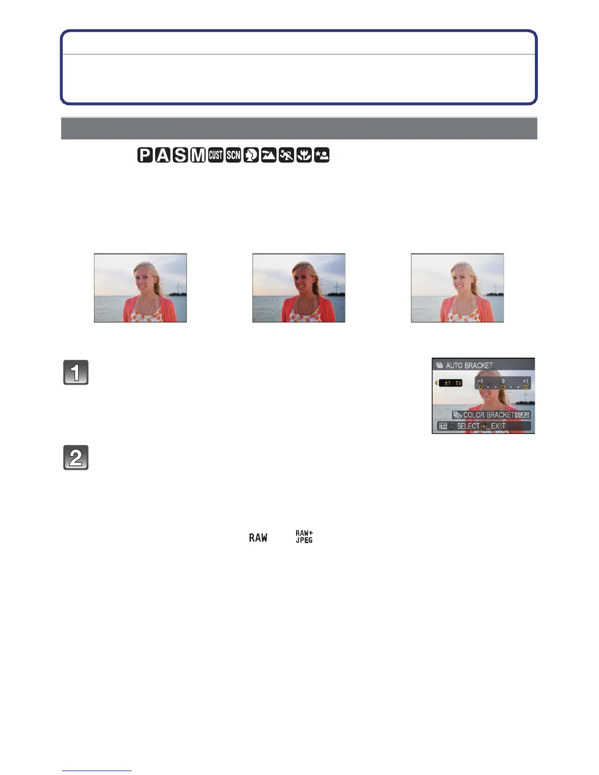 In this mode, 3 pictures are automatically recorded in the selected exposure