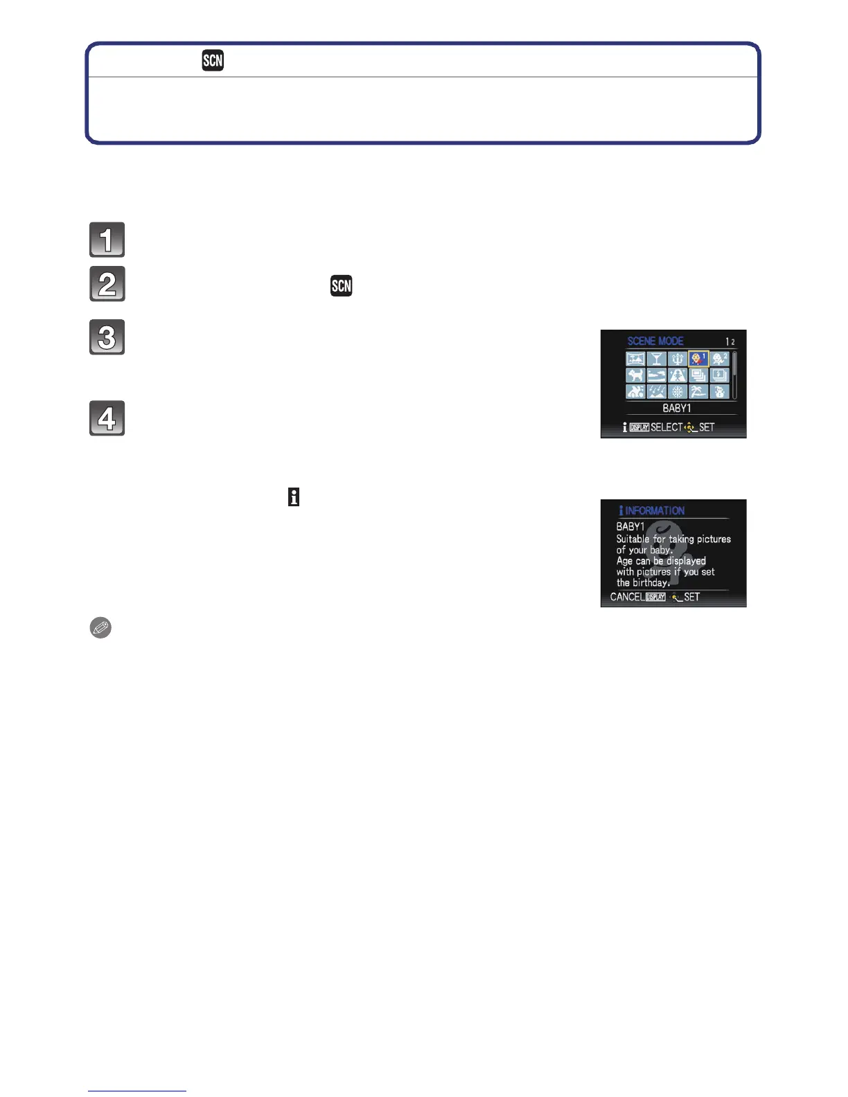If you press [DISPLAY] when selecting a Scene Mode in step 3,