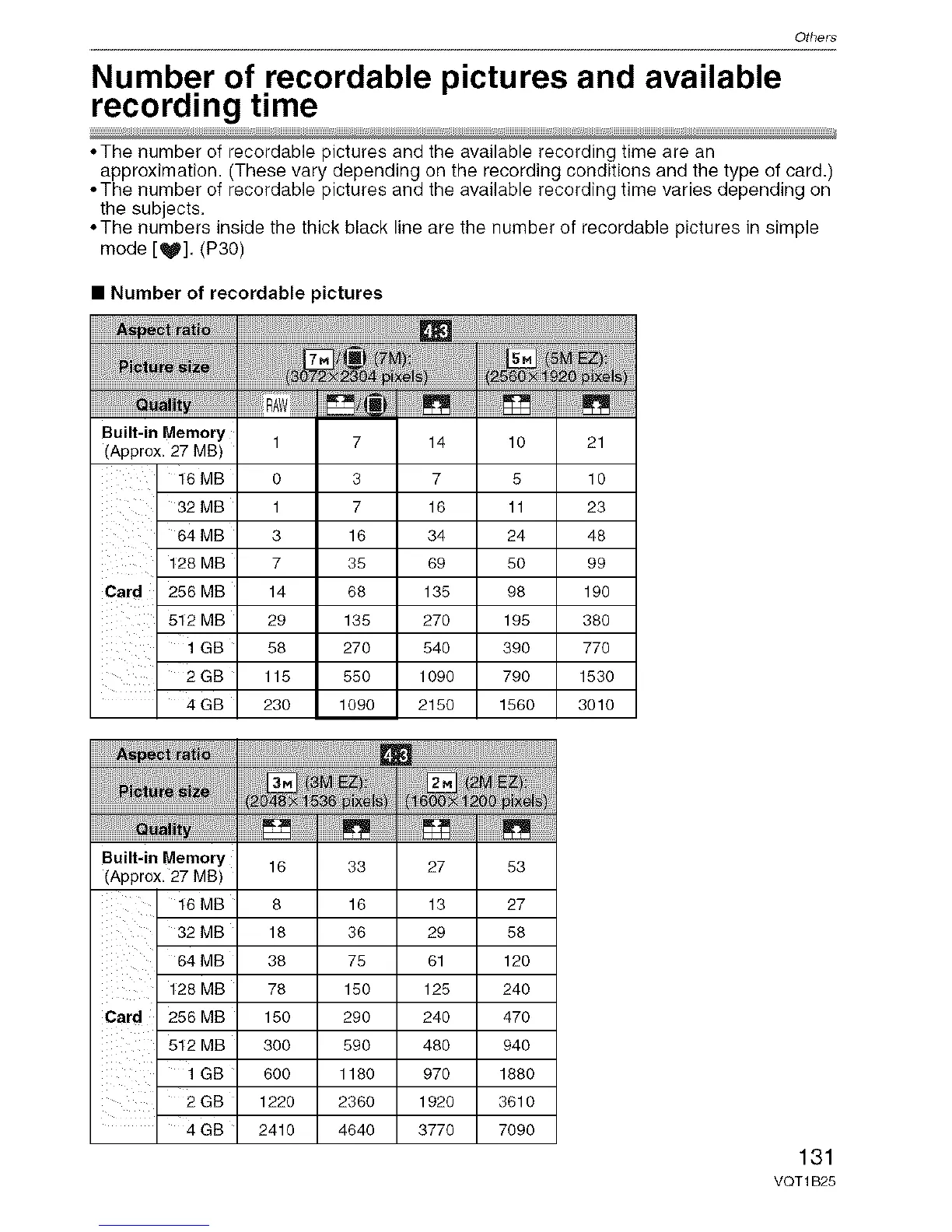 • The numbers inside the thick black line are the number of recordable pictures in simple