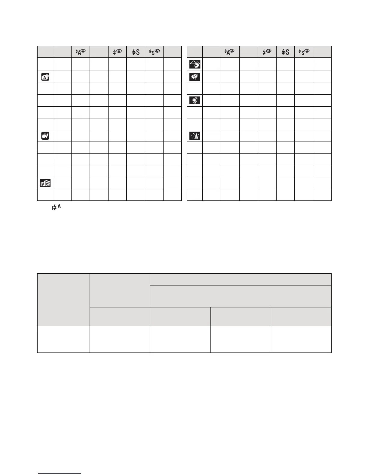 (±: Available, —: Not available, ¥: Initial setting of Scene Mode)