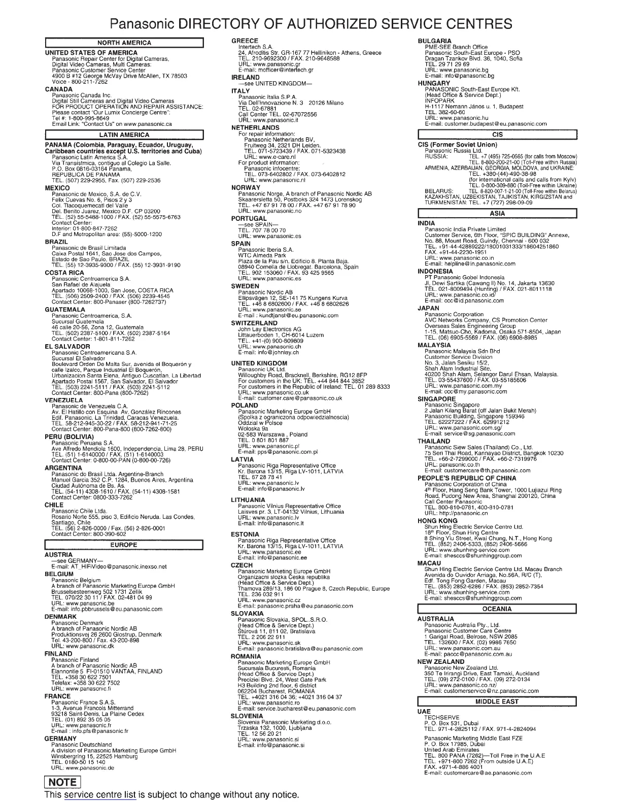 Panasonic DIRECTORY OF AUTHORIZED SERVICE CENTRES