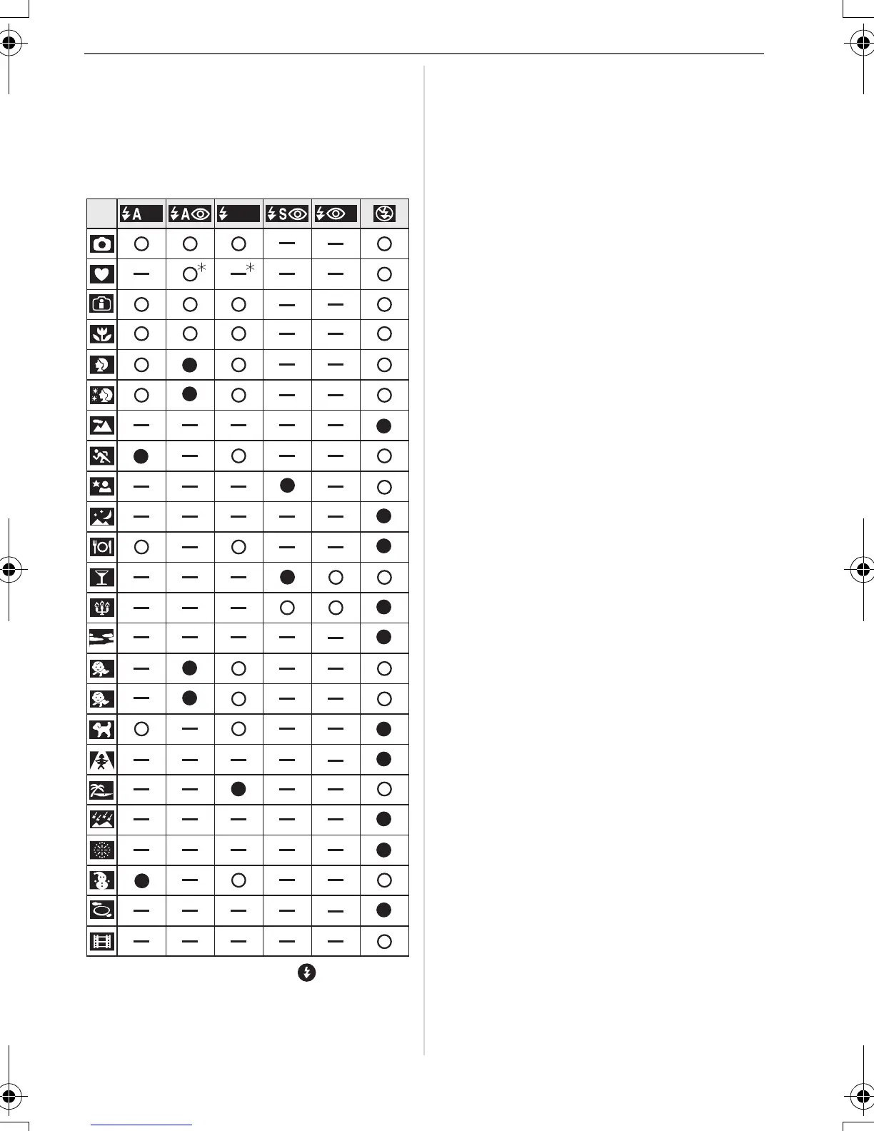 ∫ Available flash settings by recording