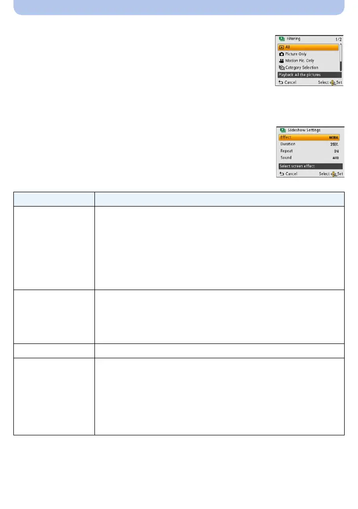 • When [Filtering] is set to [Motion Pic. Only], [Effect] is fixed to [OFF].