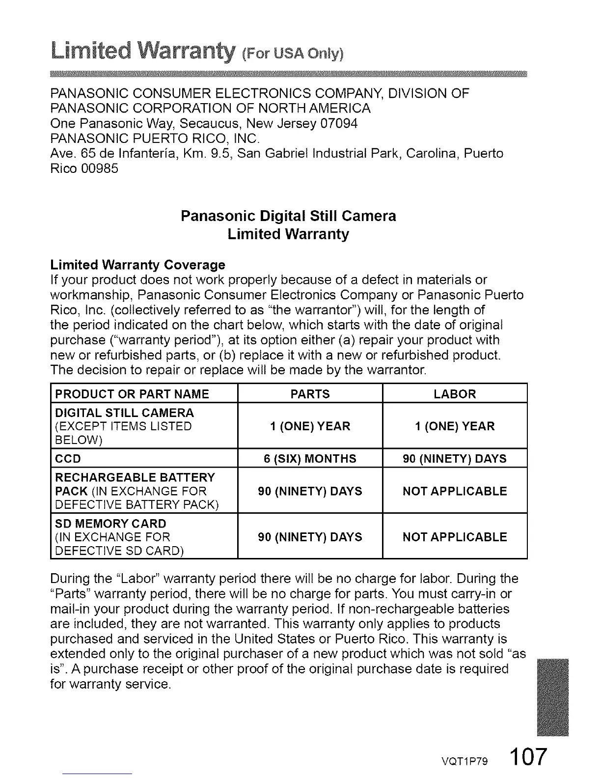 workmanship, Panasonic Consumer Electronics Company or Panasonic Puerto