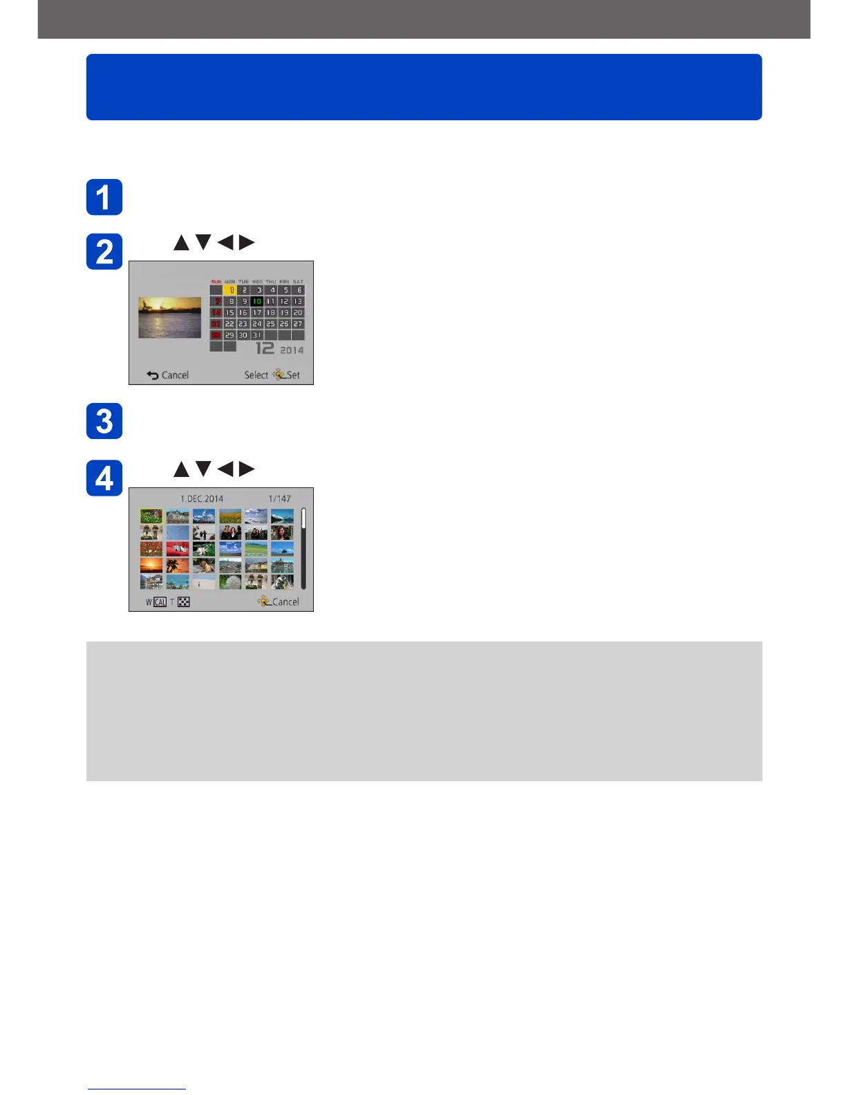 Select [Calendar] from the [Playback Mode] menu (→159)