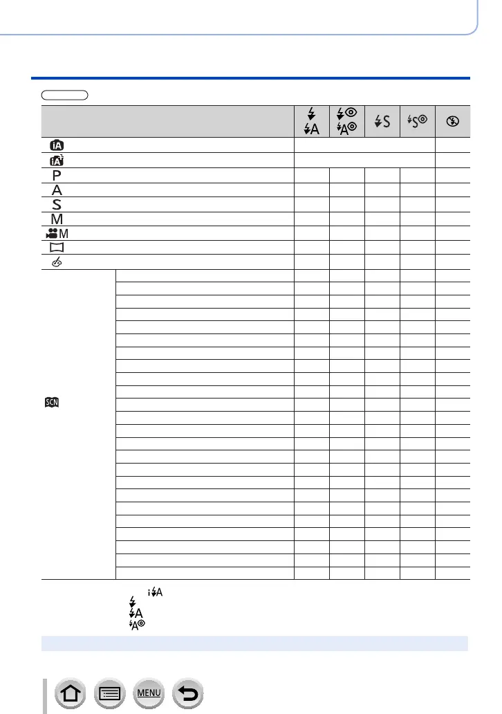 Flash settings for each Recording mode (○: Available, –: Not available)