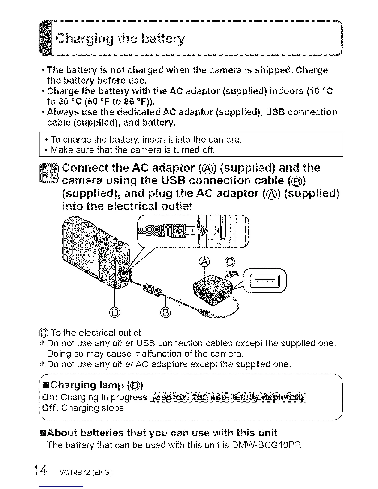 • Charge the battery with the AC adaptor (supplied) indoors (10 °C