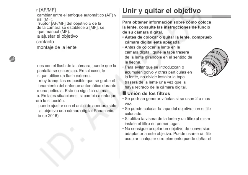 • Se puede colocar la tapa del objetivo con el filtro ya