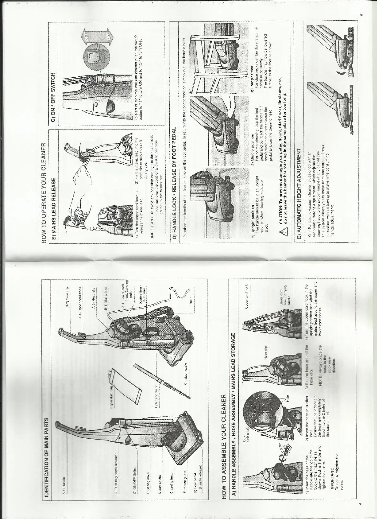 Panasonic MC-UG302 - Identification of Main Parts; Handle, Hose, and Mains Lead Storage; Operating Your Cleaner; Mains Lead Release and On;Off Switch