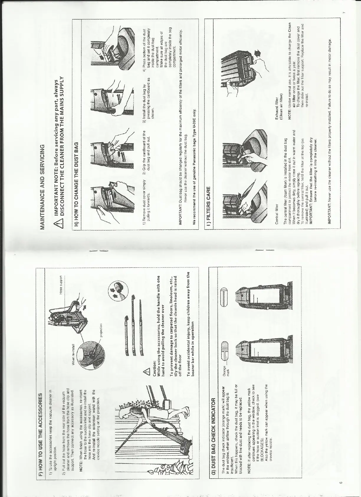 Panasonic MC-UG302 - Maintenance and Servicing; How to Change the Dust Bag; Dust Bag Check Indicator; Filters Care