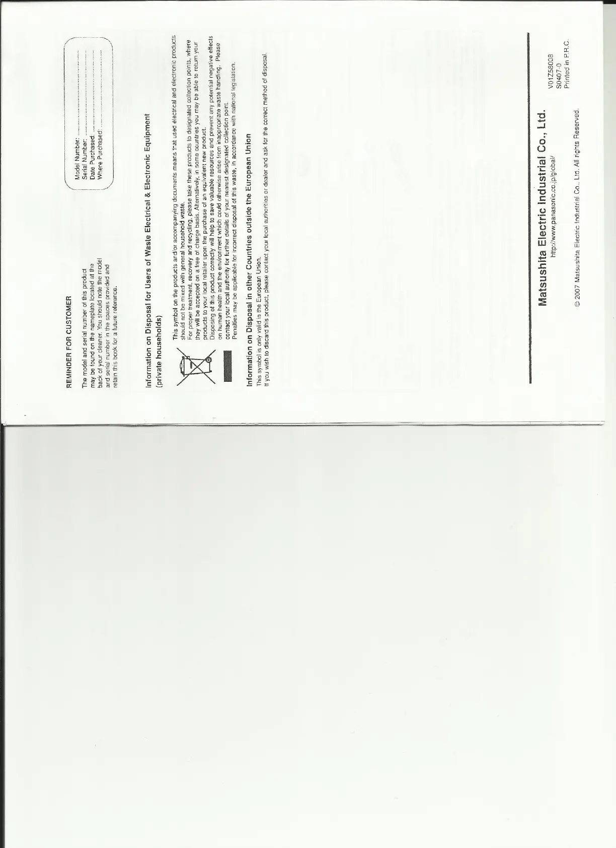 Panasonic MC-UG302 - Customer Reminder; Disposal Information (EU)