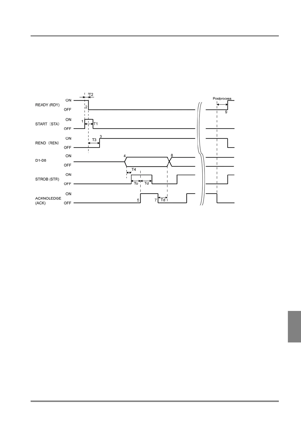 8. Check the ACK signal OFF and wait Td. The next output data (D1-D8) are output. Repeat the steps