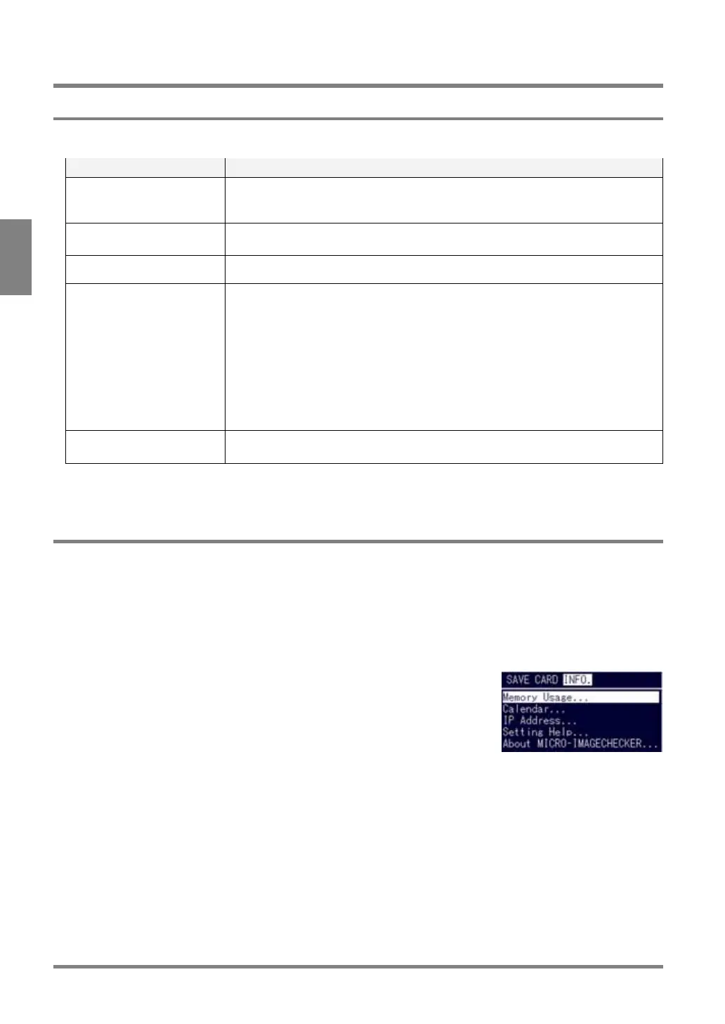 The setting information on the following five menu options is displayed by selecting “INFO.” from the menu bar.