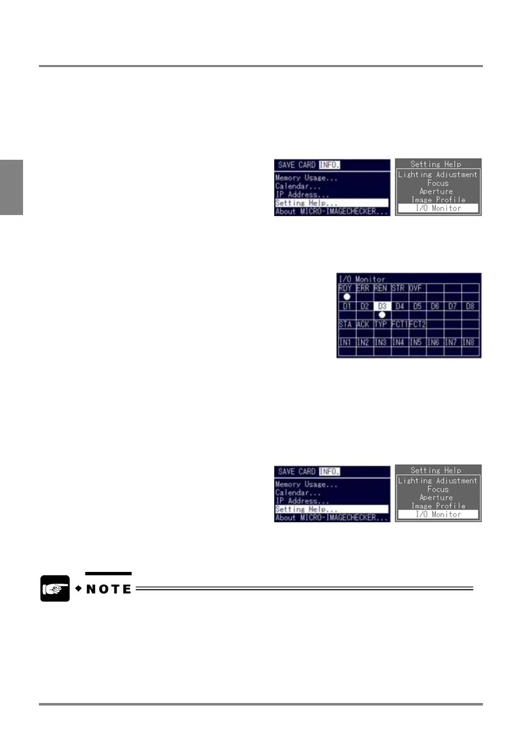 1. Select “INFO.” > “Setting Help” > “I/O Monitor” from the menu bar.
