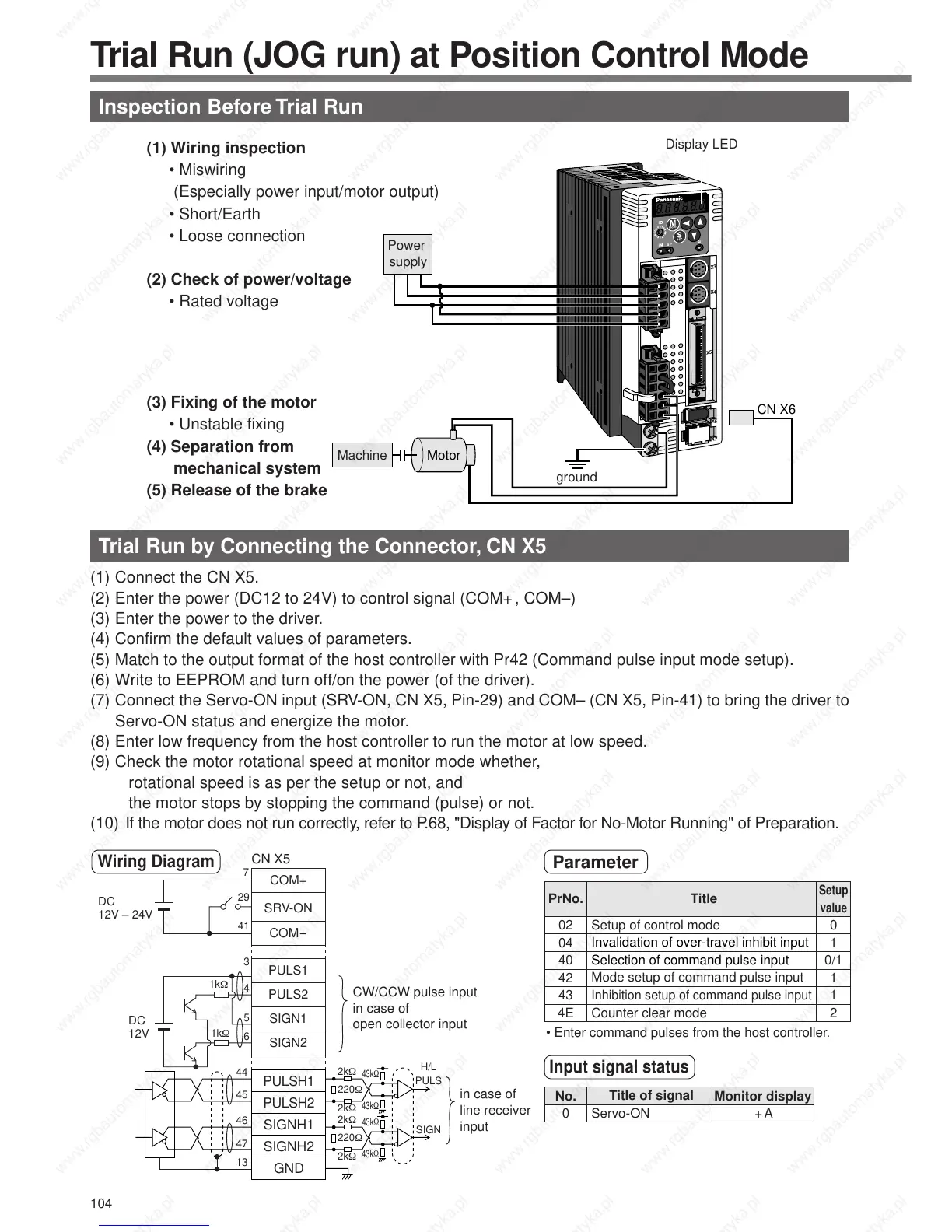 (7) Connect the Servo-ON input (SRV-ON, CN X5, Pin-29) and COM– (CN X5, Pin-41) to bring the driver to