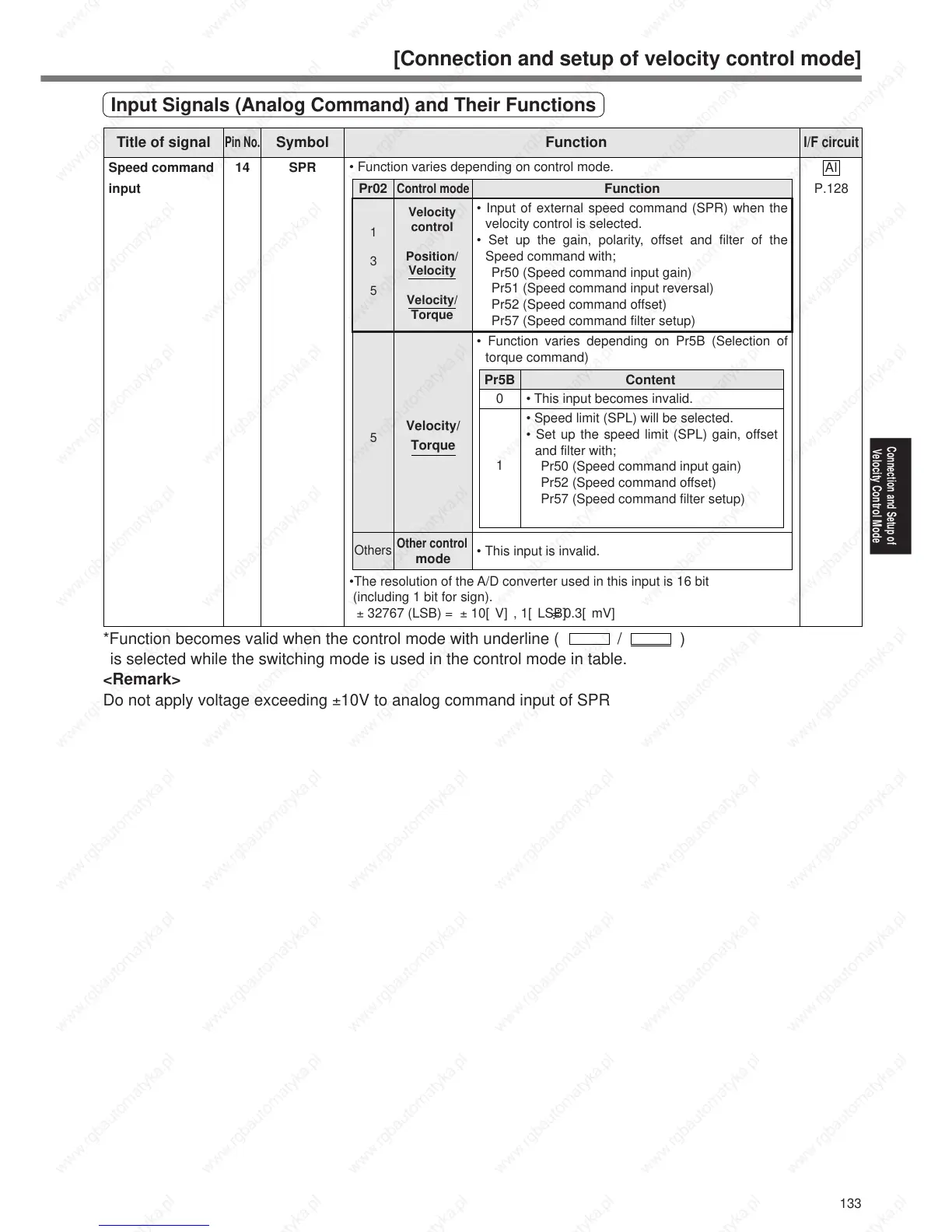 Do not apply voltage exceeding ±10V to analog command input of SPR