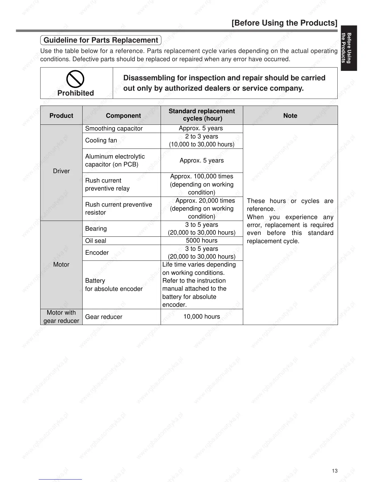 Use the table below for a reference. Parts replacement cycle varies depending on the actual operating