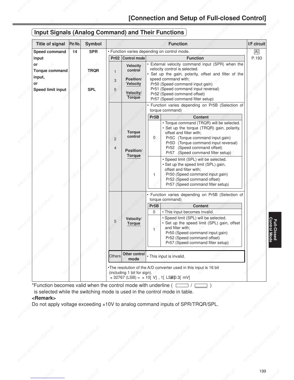 Do not apply voltage exceeding ±10V to analog command inputs of SPR/TRQR/SPL.