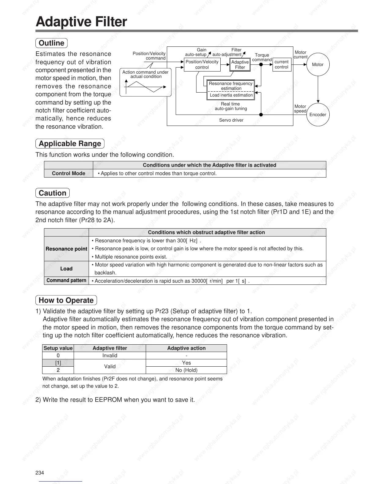 1) Validate the adaptive filter by setting up Pr23 (Setup of adaptive filter) to 1.