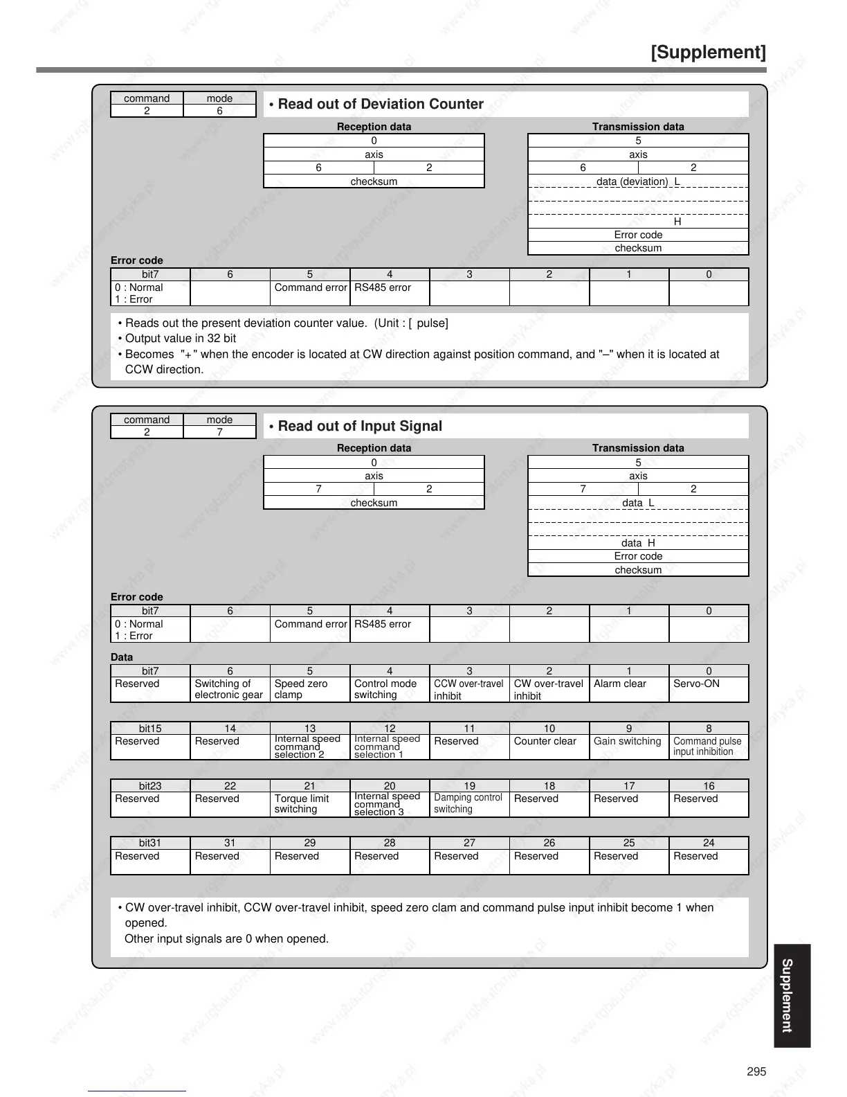 • CW over-travel inhibit, CCW over-travel inhibit, speed zero clam and command pulse input inhibit become 1 when