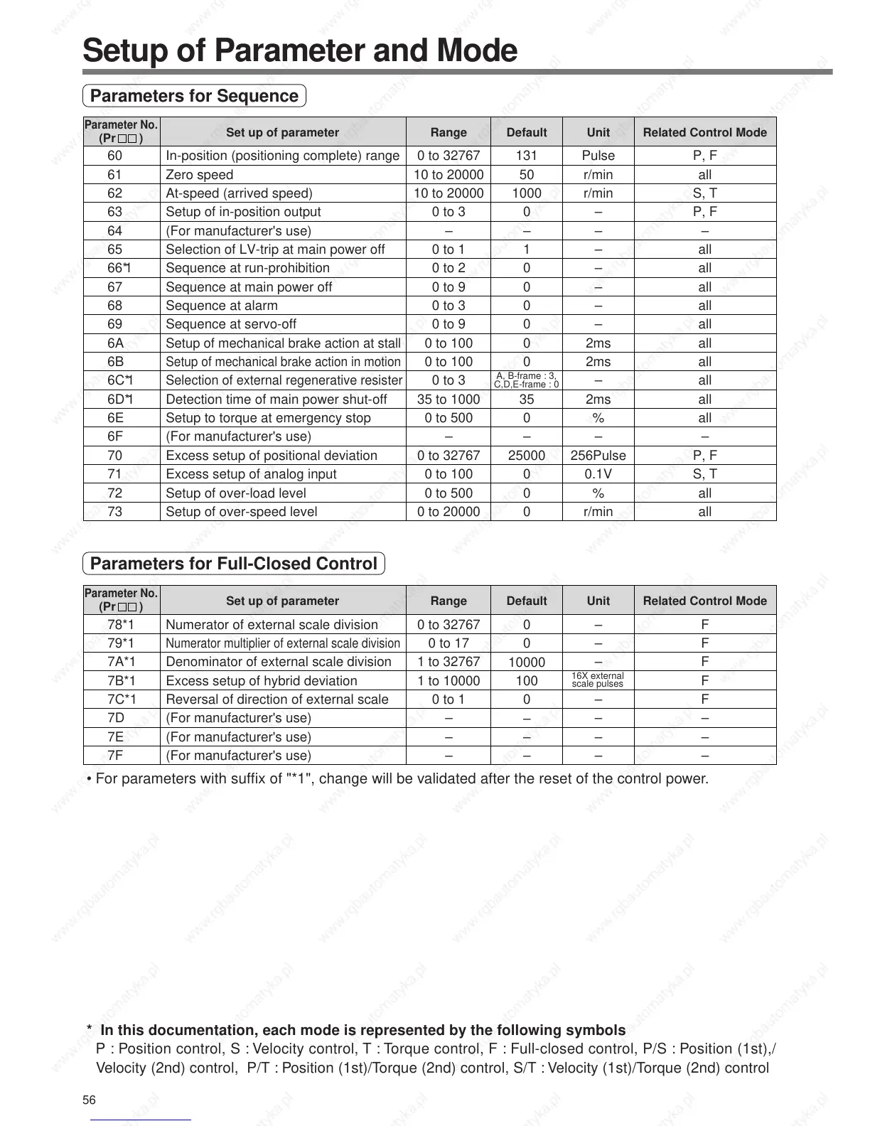 P : Position control, S : Velocity control, T : Torque control, F : Full-closed control, P/S : Position (1st),/