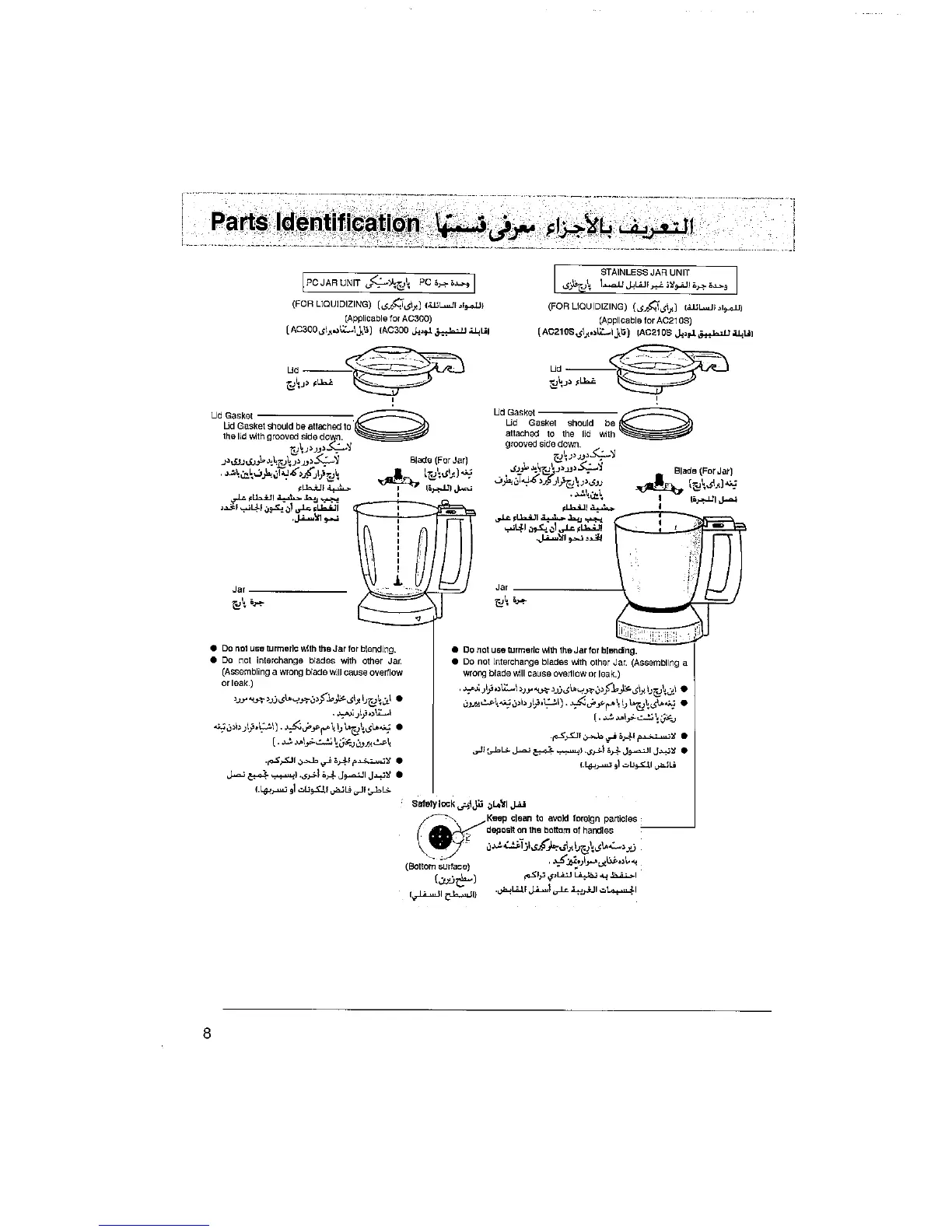 Panasonic MX-AC300 - Parts Identification; Stainless Jar Unit Components; PC Jar Unit Components; Safety Lock Mechanism