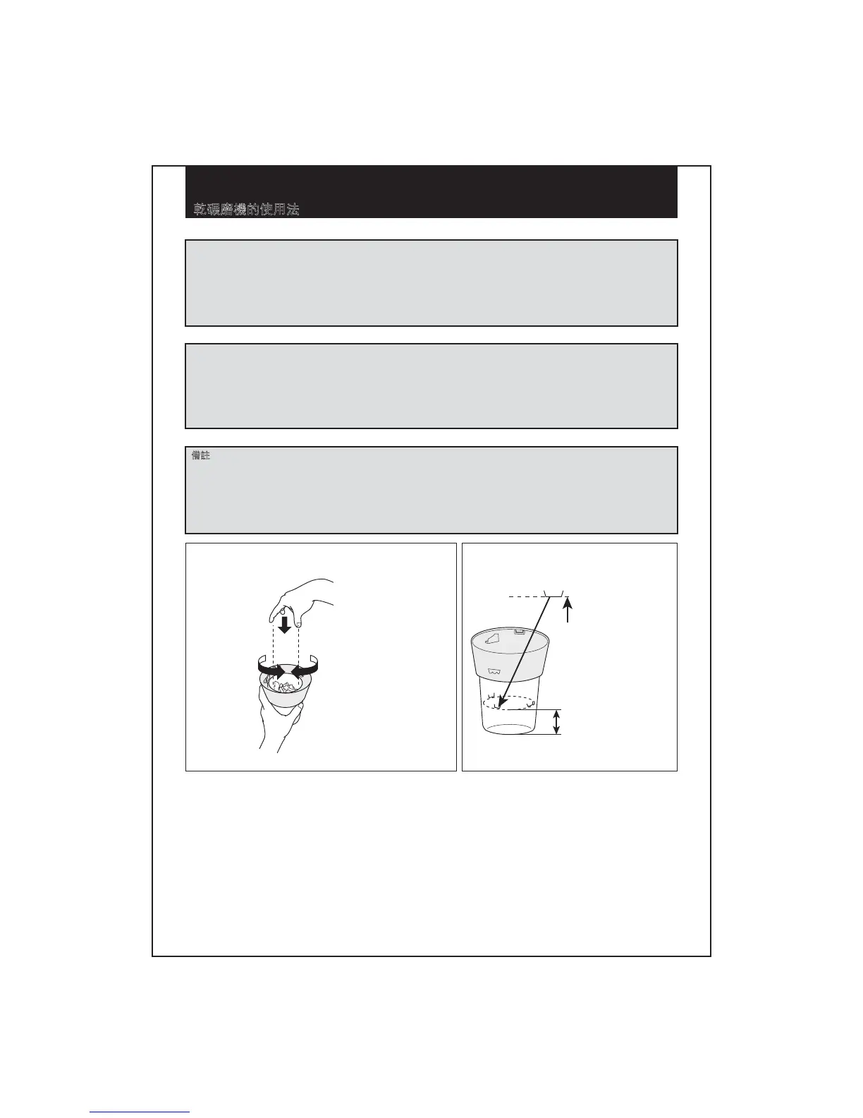 • 請勿在乾碾磨機容器處於無材料的情況下使用。
