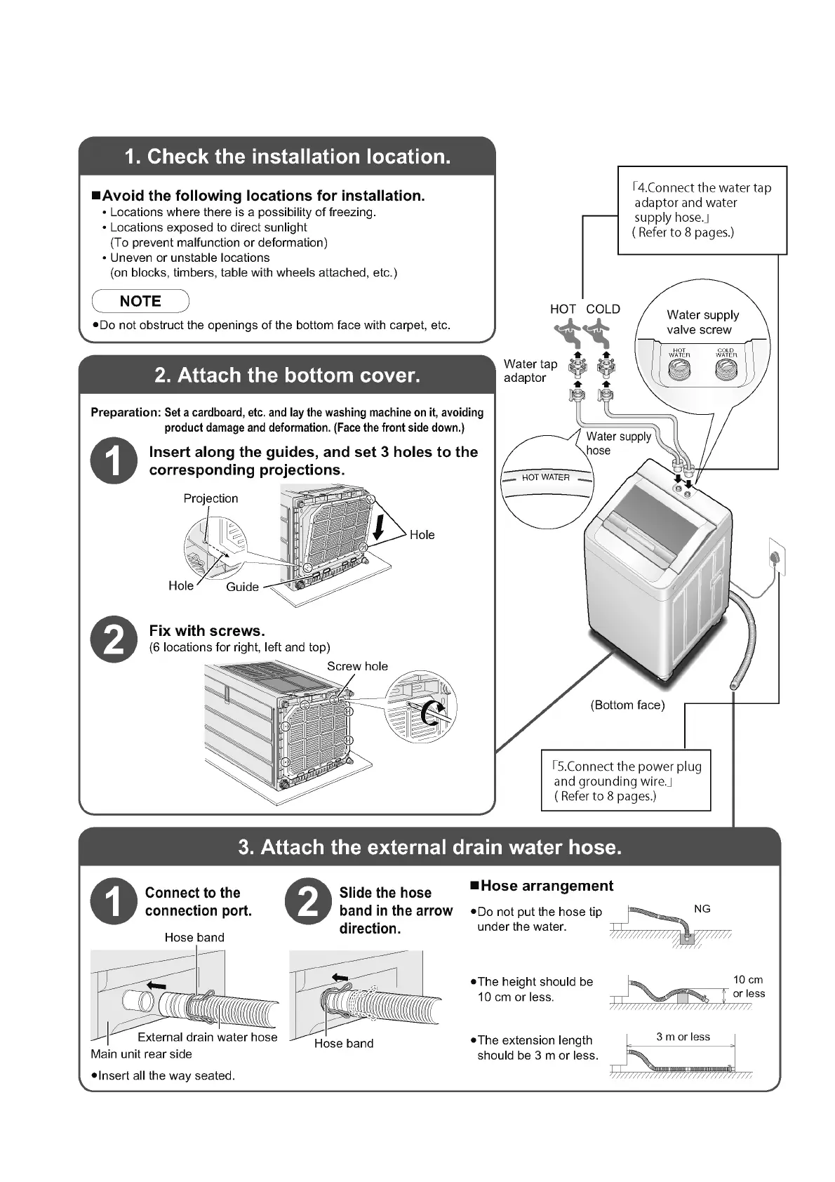 Panasonic NA-F75G6 - Installation Instructions; Installation Location Check; Attaching the Bottom Cover; External Drain Water Hose Attachment