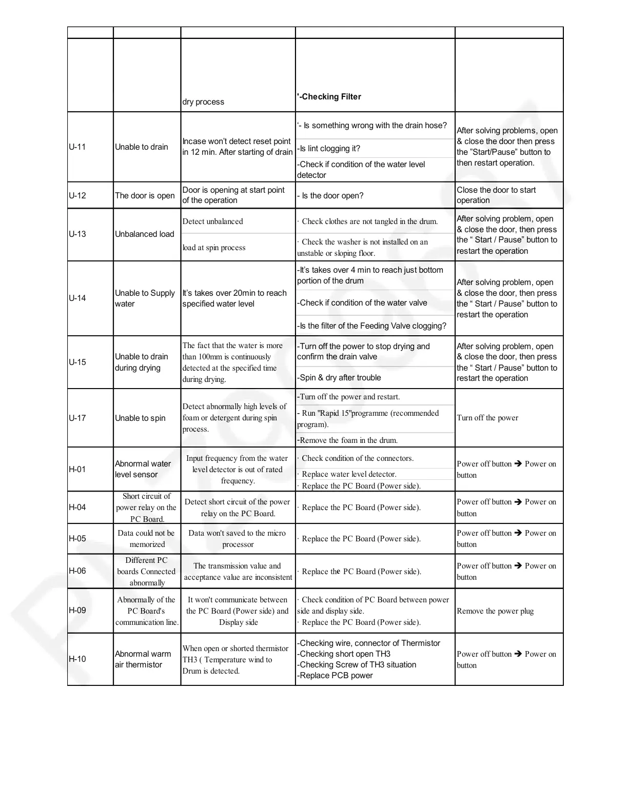 Detect unbalanced · Check clothes are not tangled in the drum.