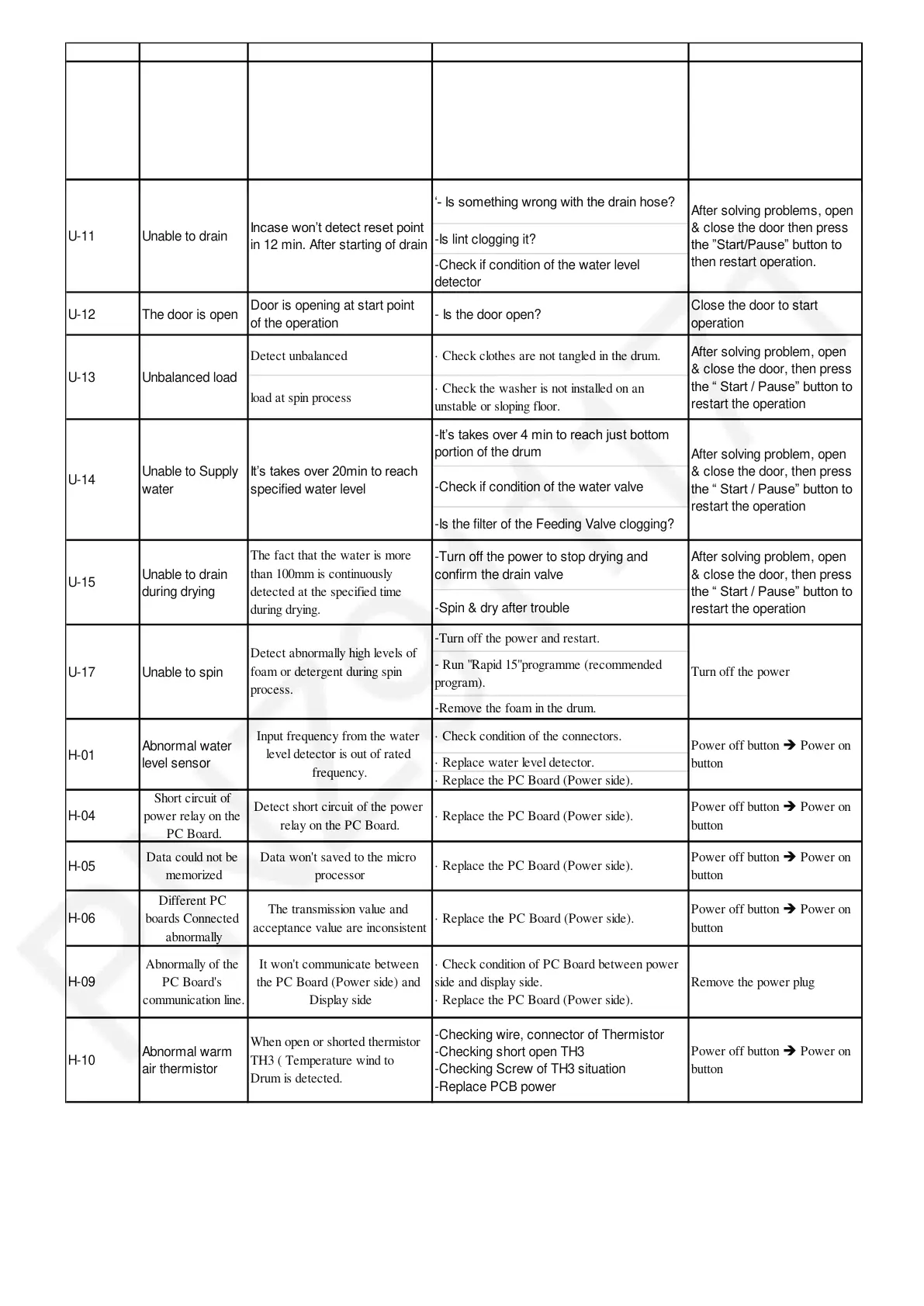 Detect unbalanced · Check clothes are not tangled in the drum.