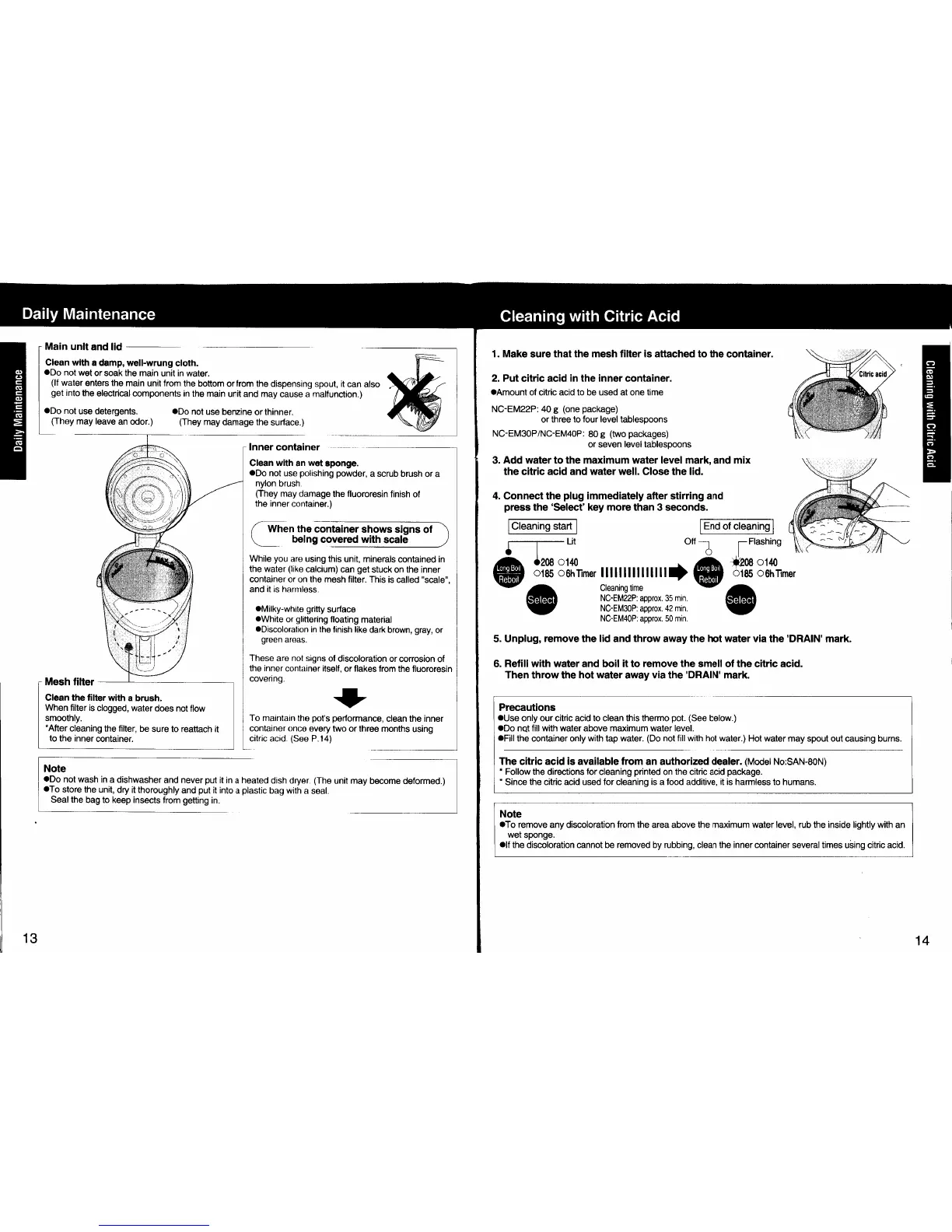 Panasonic NC-EM22P - Cleaning with Citric Acid; Daily Maintenance; Main Unit and Lid; Mesh Filter