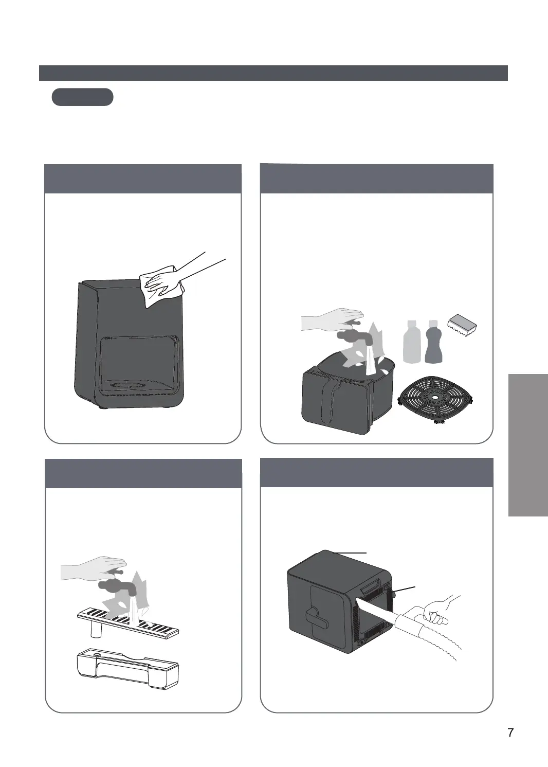 ● Do not put any parts other than the baking tray, water tank, and water tank cap in the dishwasher or dryer.