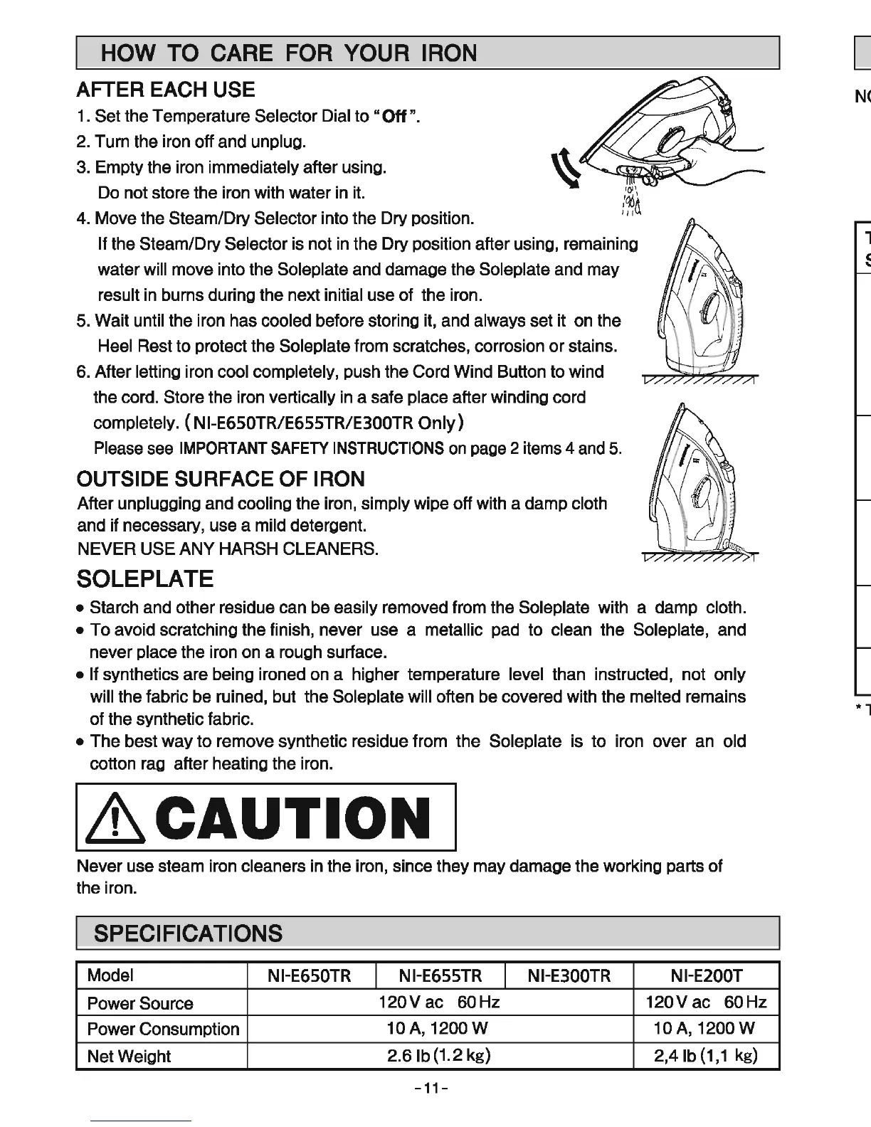 Panasonic NI-E300TR - How to Care for Your Iron; After each Use; Outside Surface of Iron; Soleplate