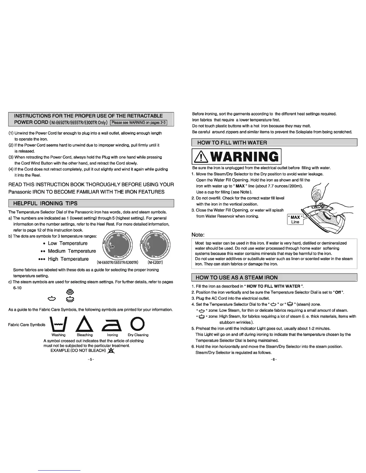 Panasonic NI-E650TR - HOW TO FILL WITH WATER; HOW TO USE AS A STEAM IRON
