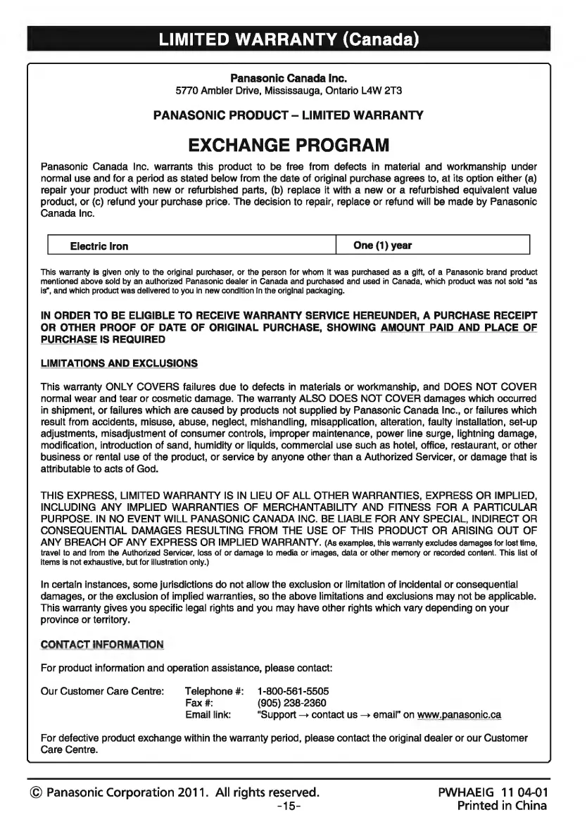 Panasonic NI-E655TR - Limited Warranty (Canada)