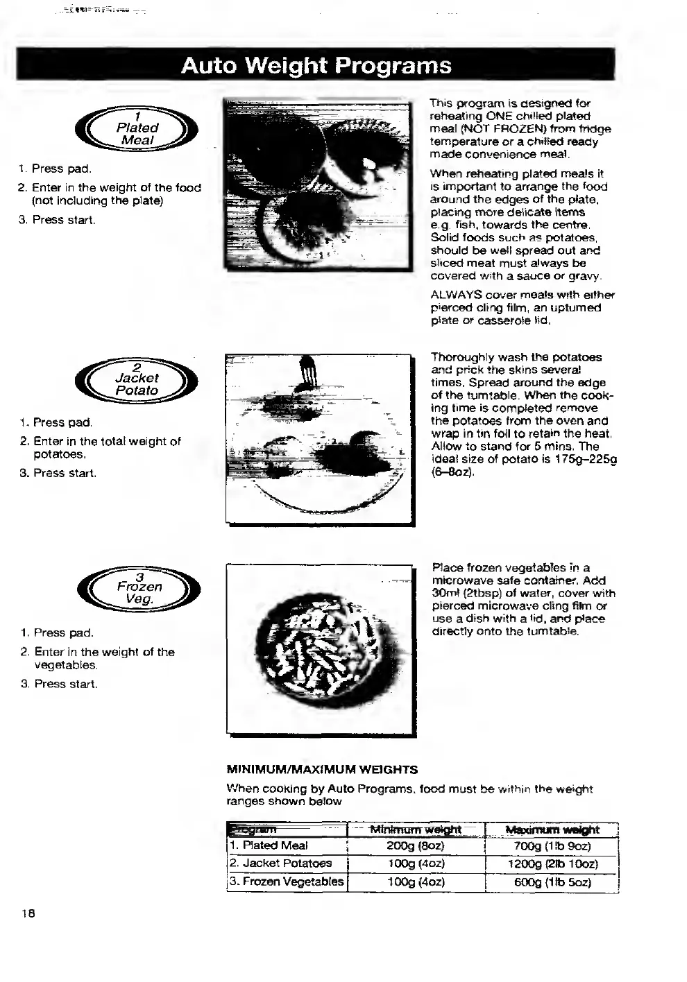 Panasonic NN-3496 - Auto Weight Program Details; Specific Meal Program Instructions