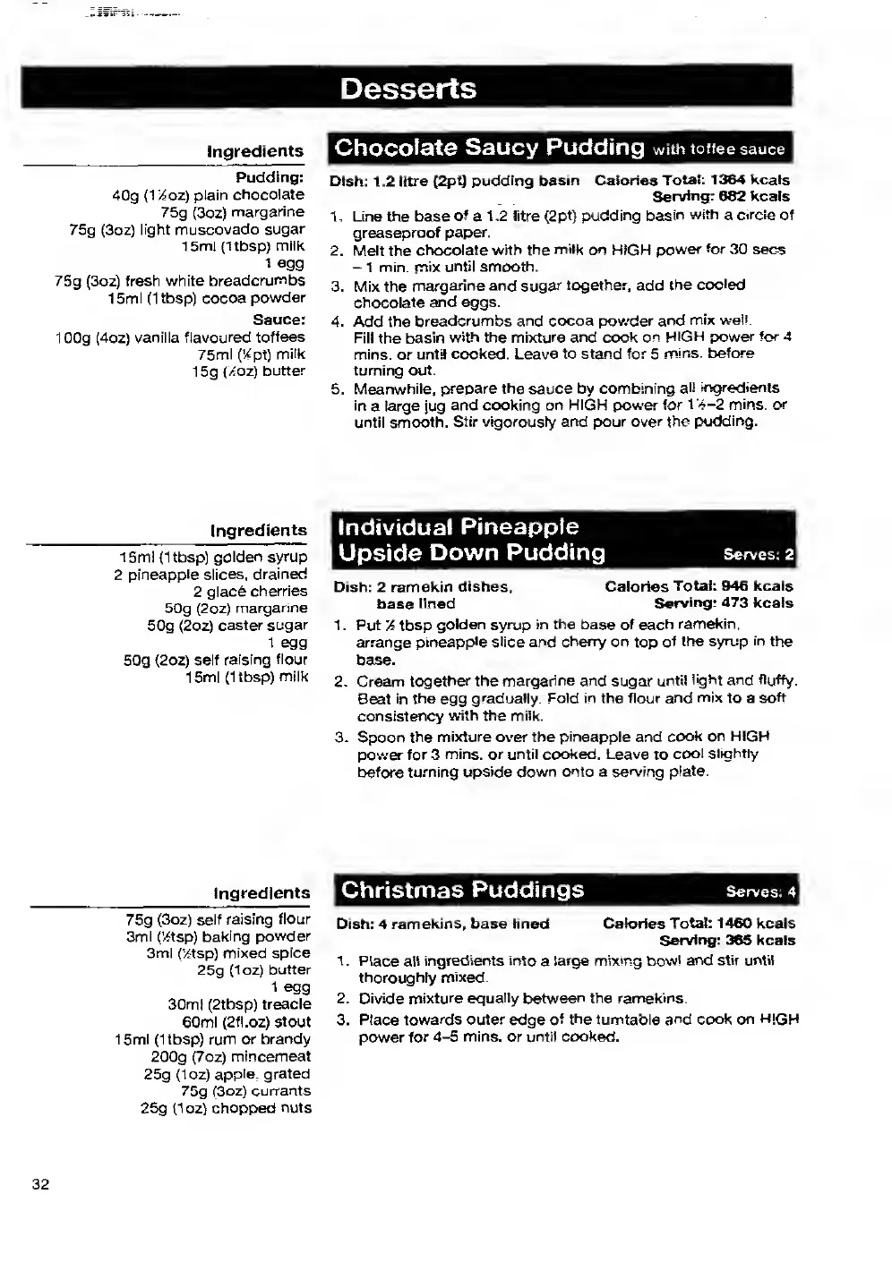Panasonic NN-3496 - Dessert Recipes; Chocolate Pudding, Pineapple Pudding, and Christmas Puddings