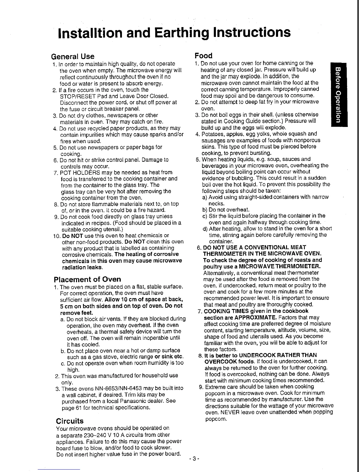 Panasonic NN-5655 - Installation and Earthing; General Use Guidelines; Oven Placement Requirements; Electrical Circuit Requirements