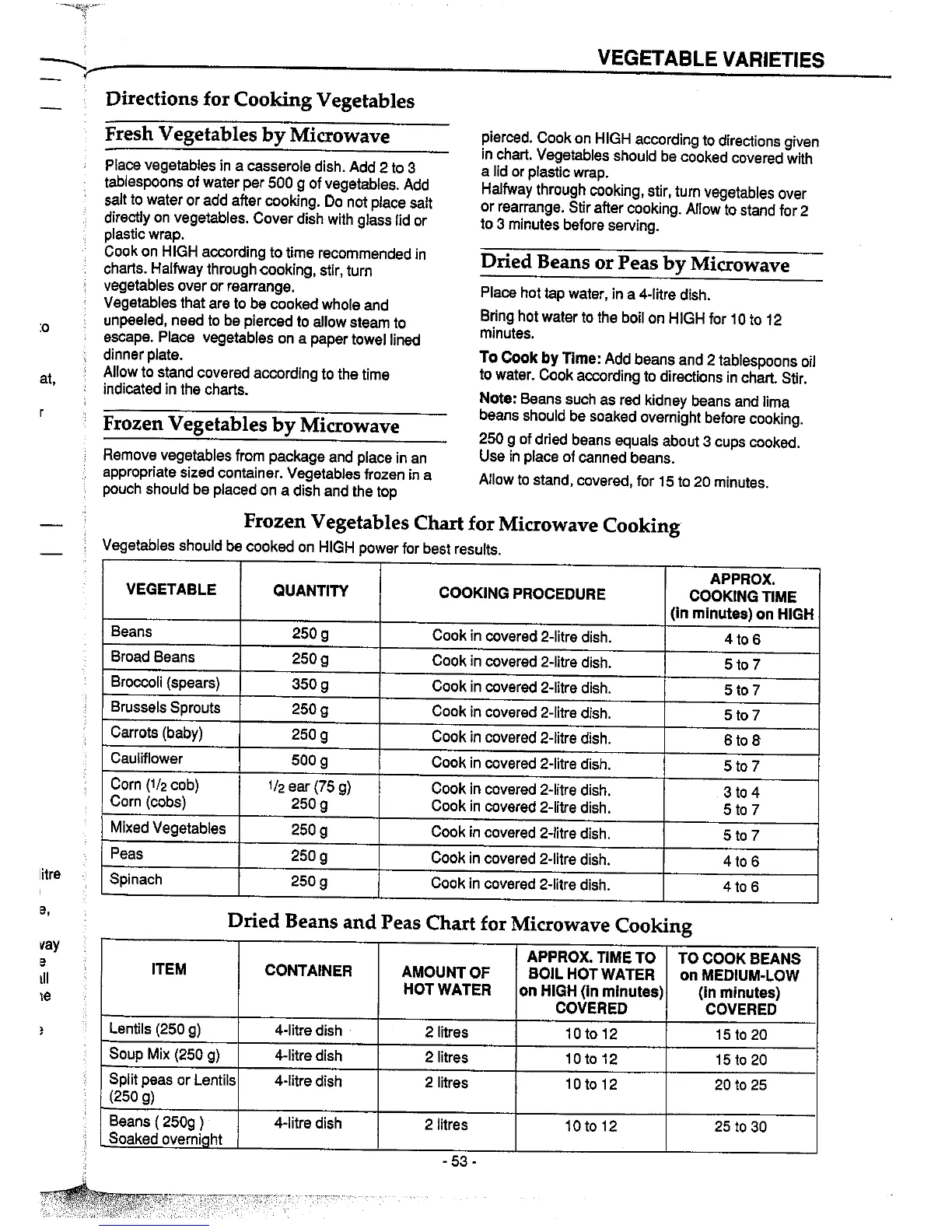 Panasonic NN-5752 - Vegetable Varieties; Directions for Cooking Vegetables; Frozen Vegetables Chart for Microwave Cooking; Dried Beans and Peas Chart for Microwave Cooking