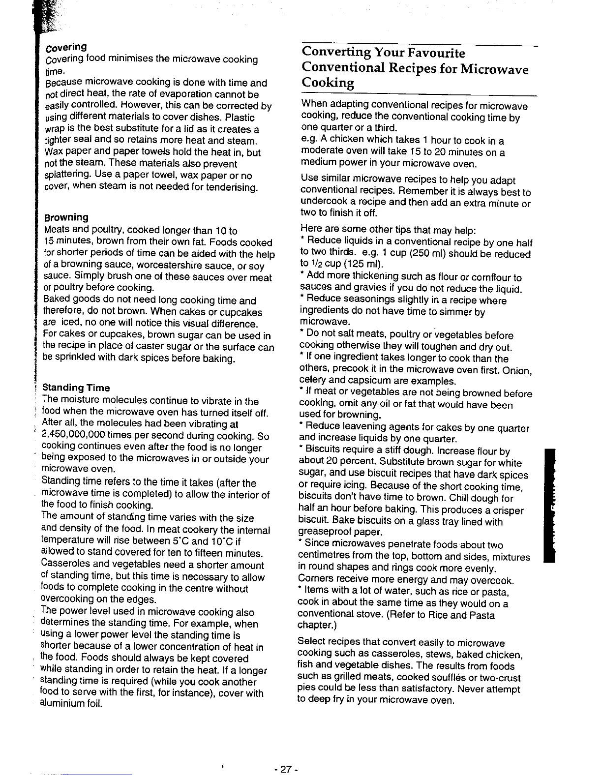 Panasonic NN-6803 - Microwave Cooking Techniques; Covering, Browning, and Standing Time Tips; Converting Conventional Recipes for Microwave