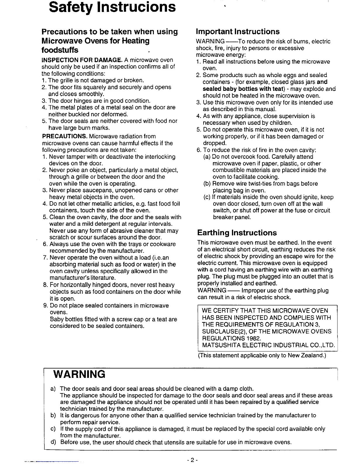 Panasonic NN-6803 - Safety Instructions; Microwave Heating Precautions; Important Operating Instructions; Earthing Instructions
