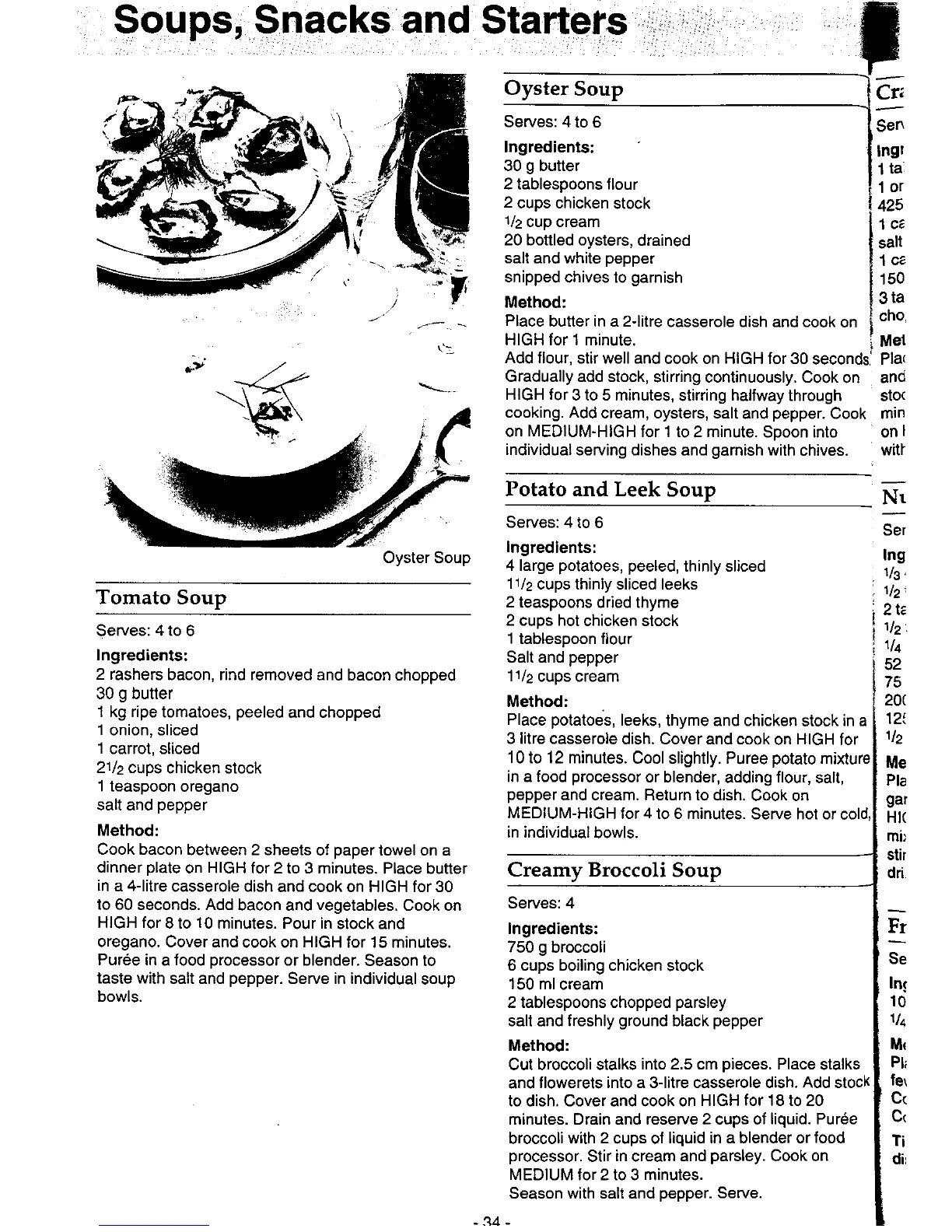 Panasonic NN-6803 - Soups, Snacks, and Starters (cont.); Oyster, Tomato, and Broccoli Soups; Potato and Leek Soup