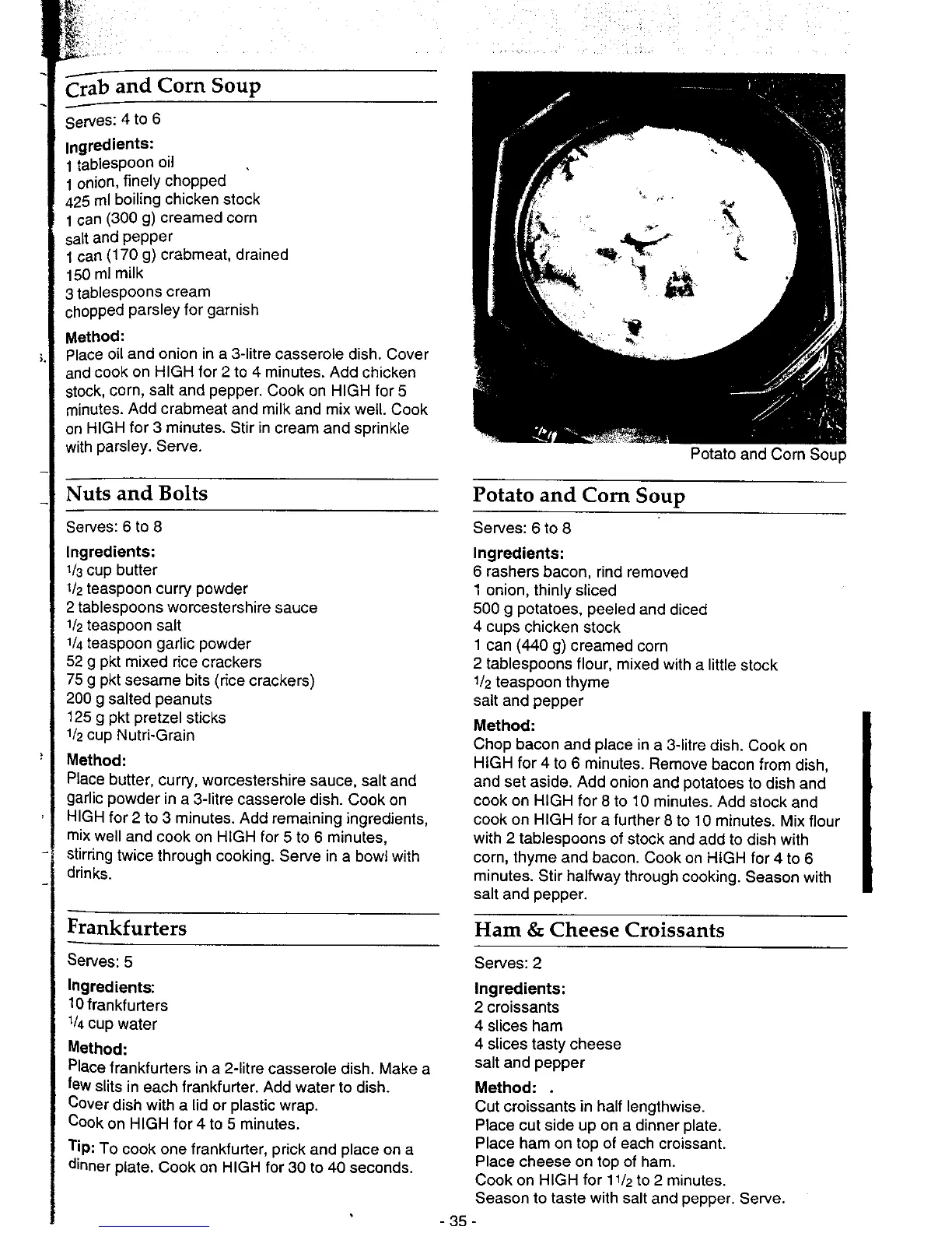 Panasonic NN-6803 - Soups, Snacks, and Starters (cont.); Crab, Nuts, Frankfurters, and Potato Corn Soup; Ham and Cheese Croissants