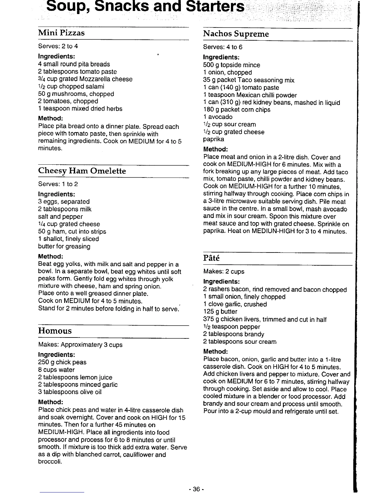 Panasonic NN-6803 - Soups, Snacks, and Starters (cont.); Mini Pizzas and Nachos Supreme; Cheesy Ham Omelette and Homous Dip; Pâté Preparation