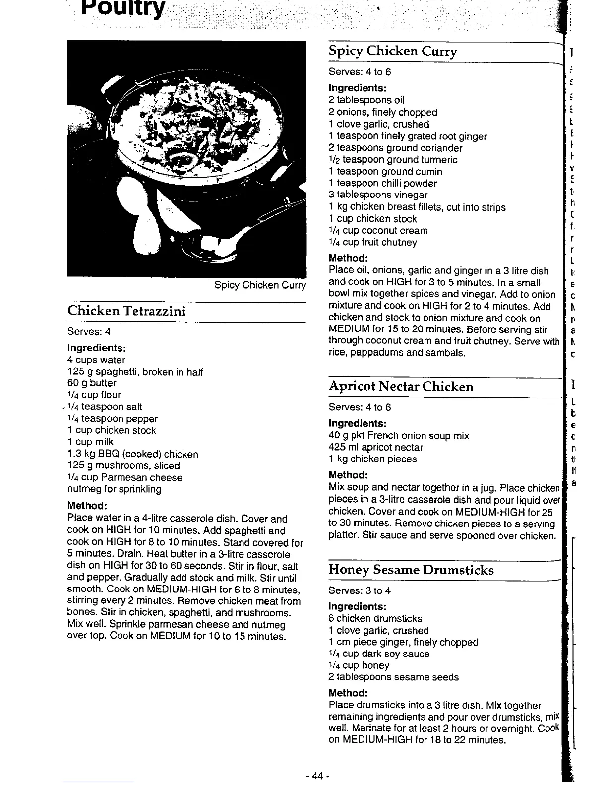 Panasonic NN-6803 - Poultry Dishes (cont.); Spicy Chicken Curry and Chicken Tetrazzini; Apricot Nectar Chicken and Honey Sesame Drumsticks