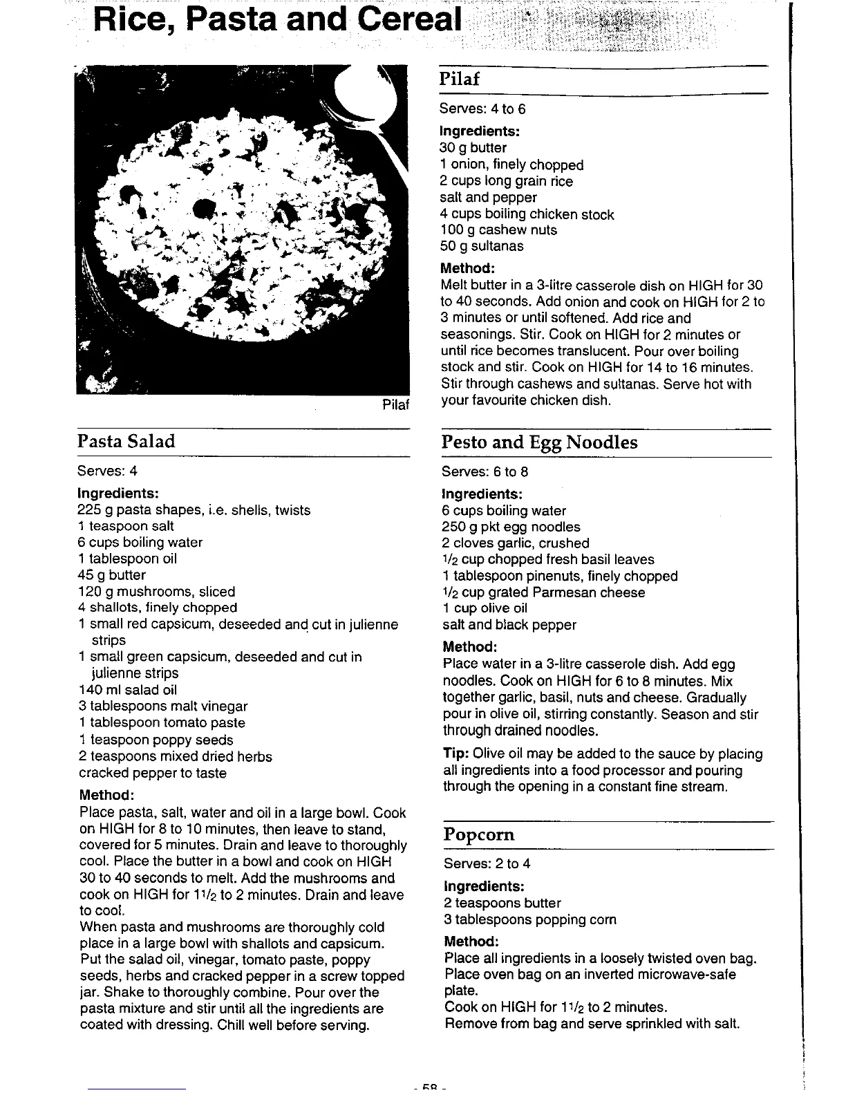 Panasonic NN-6803 - Rice, Pasta, and Cereal Dishes (cont.); Pasta Salad and Pilaf; Pesto Egg Noodles and Popcorn